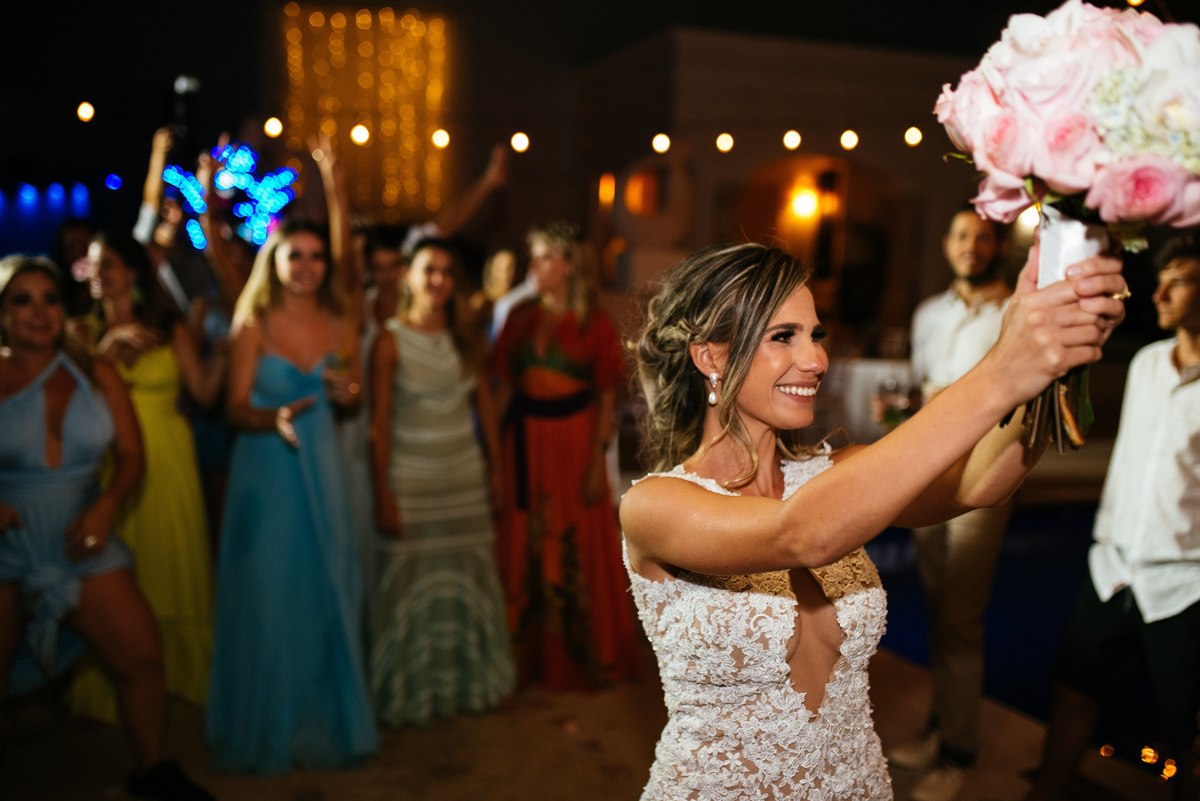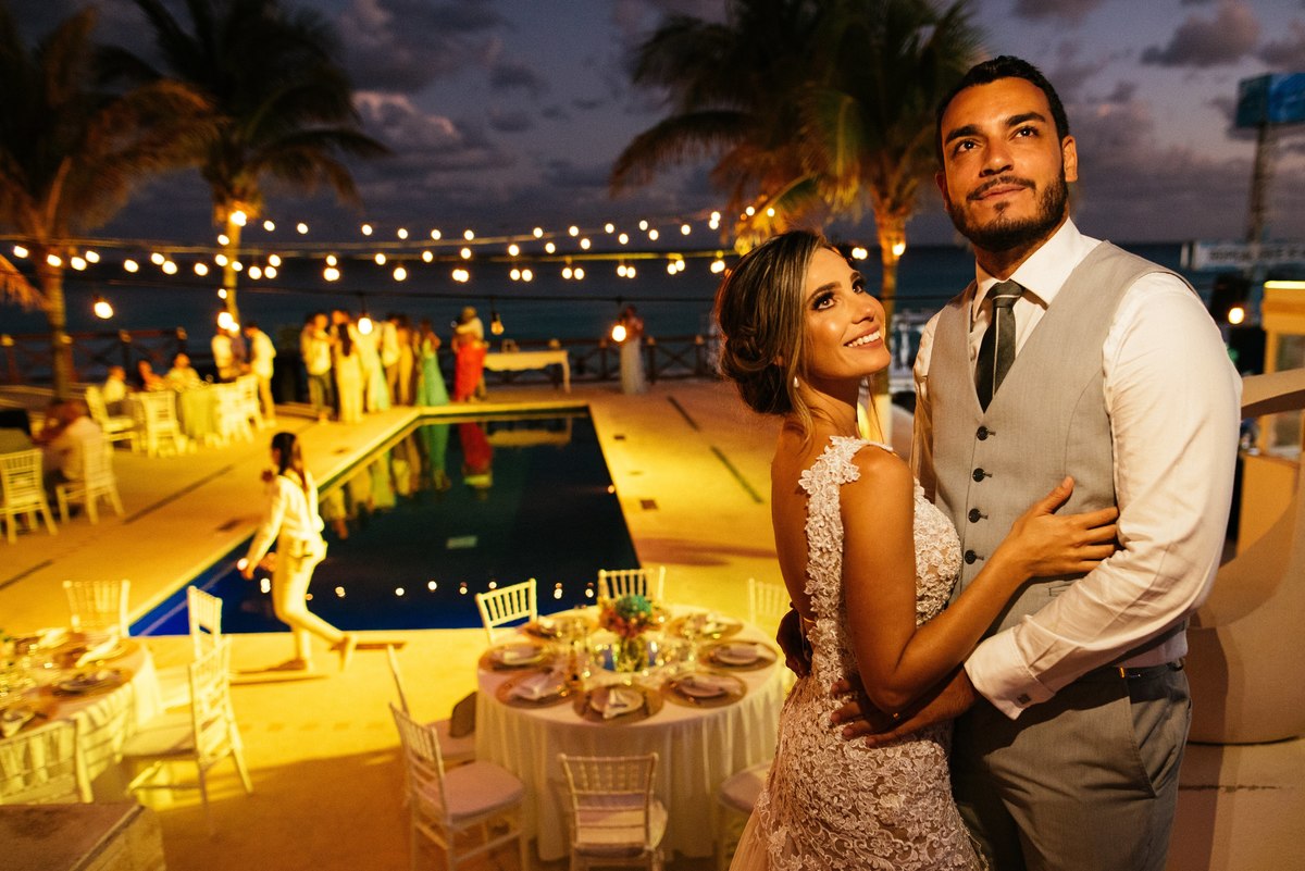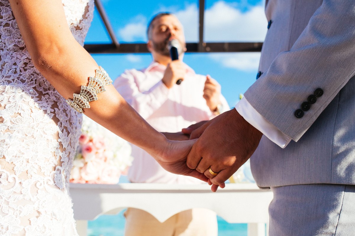 A cerimônia, realizada ao entardecer com a luz dourada do Caribe, foi um evento lindo e emocionante. Por ser um casamento intimista, apenas com os amigos mais próximos e os familiares, cada abraço e cada sorriso tinham um peso especial. Era possível sentir a conexão profunda não apenas entre os noivos, mas entre todas as pessoas ali presentes.